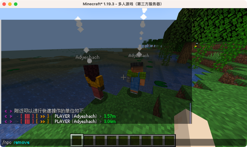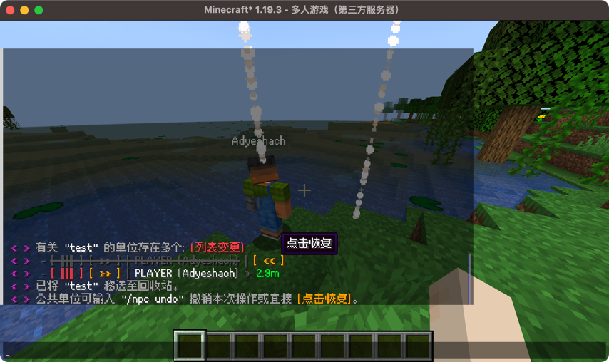 Adyeshach开始主要命令单位管理删除单位本页总览删除单位 作为核心命令,它的用法非常简单。只需输入 /npc remove <名称> 即可删除单位。 /npc remove test 插件会在编辑命令时建议出所有可用的单位名称: 删除后,单位将会消失: 提示对于公共单位,将会在删除后移送至回收站,以便于管理员进行恢复。 名称重复 若删除的单位名称与其他单位重复,插件将会进行二次确认: 你可以点击确认信息中的 红色 按钮精确删除,也可以点击 橙色 按钮传送至单位所在位置。 就近删除 你也可以省略单位名称,直接输入 /npc remove 来删除你所在位置附近(16)的单位: 警告如果附近(16)只有一个单位,将不会出现二次确认信息。