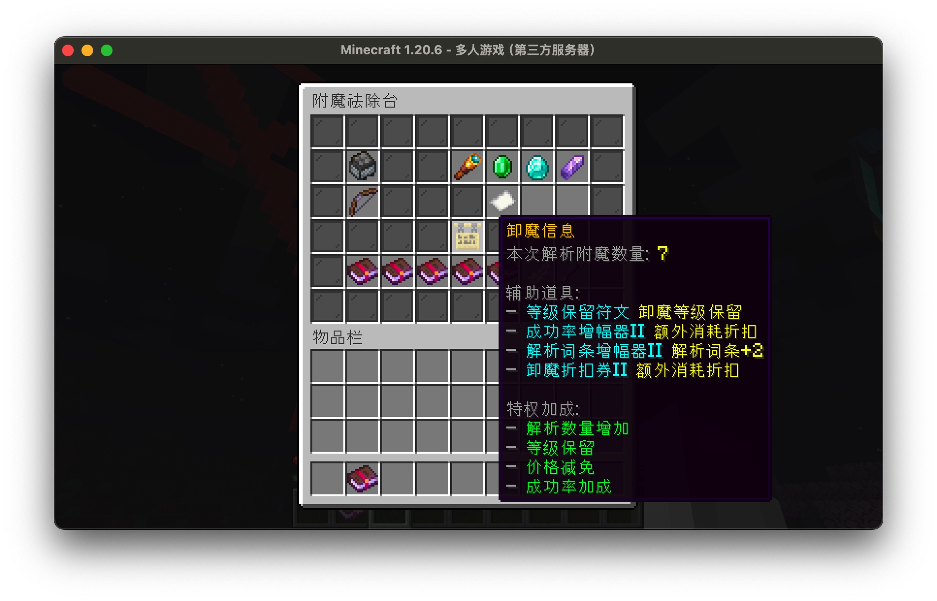 附魔列表上方的告示牌显示了本次拆卸附魔的信息,包括本次解析数量、使用的道具和特权。
